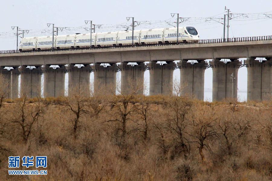 11月26日,一列动车在兰新高铁甘肃瓜州段疾驰。随着兰新高铁甘肃段联调联试工作结束,兰新高铁甘肃段顺利转入试验运行阶段,动车“西出阳关”试跑兰新高铁,预计年底全线通车。兰新高铁全长1776公里,横贯甘肃、青海、新疆三地,是中国首条在高海拔地区修建的高速铁路,11月16日,乌鲁木齐南至哈密段正式开通,为年底全线贯通拉开序幕。 新华社发(蔡增乐 摄)