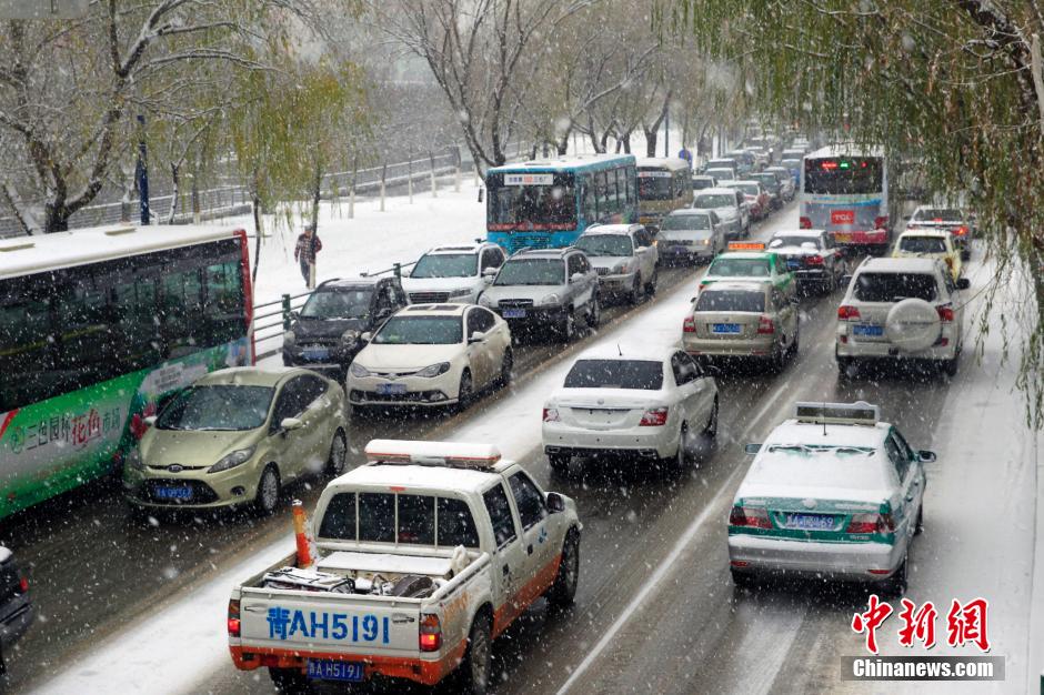 图为降雪致西宁市区交通出现拥堵。 胡贵龙 摄