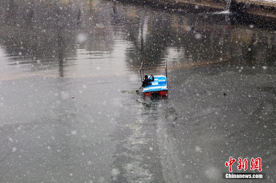 图为一名工作人员驾船在南川河内滑行,避免水面结冰。 胡贵龙 摄