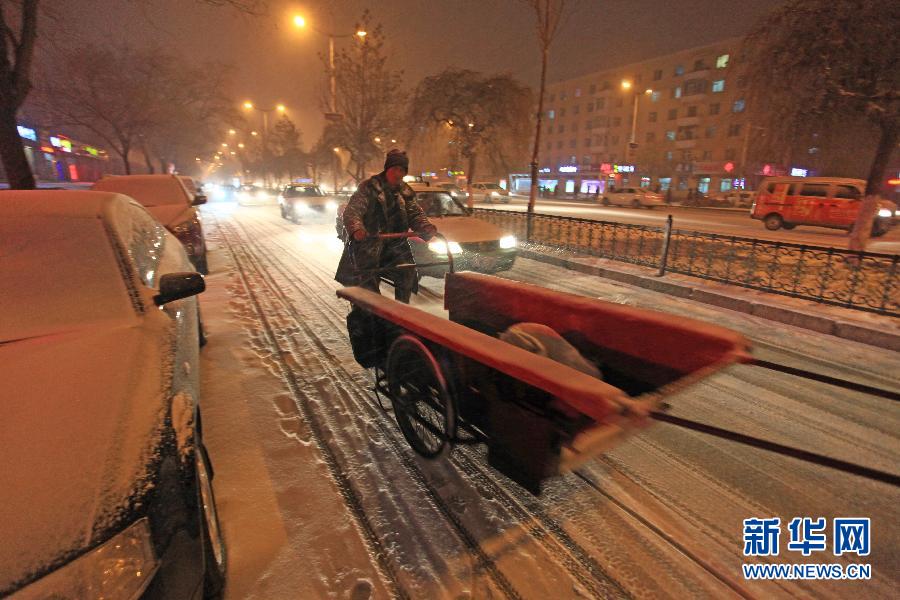 当日,吉林省吉林市迎来强降雪,吉林气象台发布暴雪黄色预警、寒潮黄色预警,预计未来24小时,吉林省中东部地区有大到暴雪,气温将明显下降,大部分地区降温幅度可达7—10摄氏度。 新华社发(朱万昌 摄)