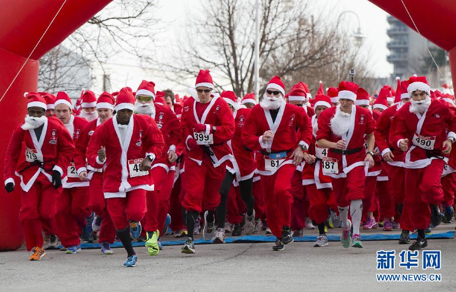 11月30日,在加拿大安大略省汉密尔顿市,身着圣诞老人服装的参赛者在比赛中。当日,汉密尔顿市举办一年一度的圣诞老人五公里跑比赛,吸引近千名“圣诞老人”积极参与。 新华社发(邹峥摄)