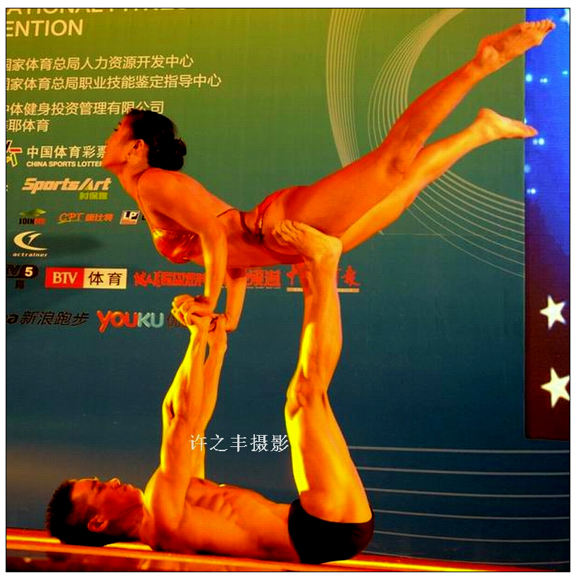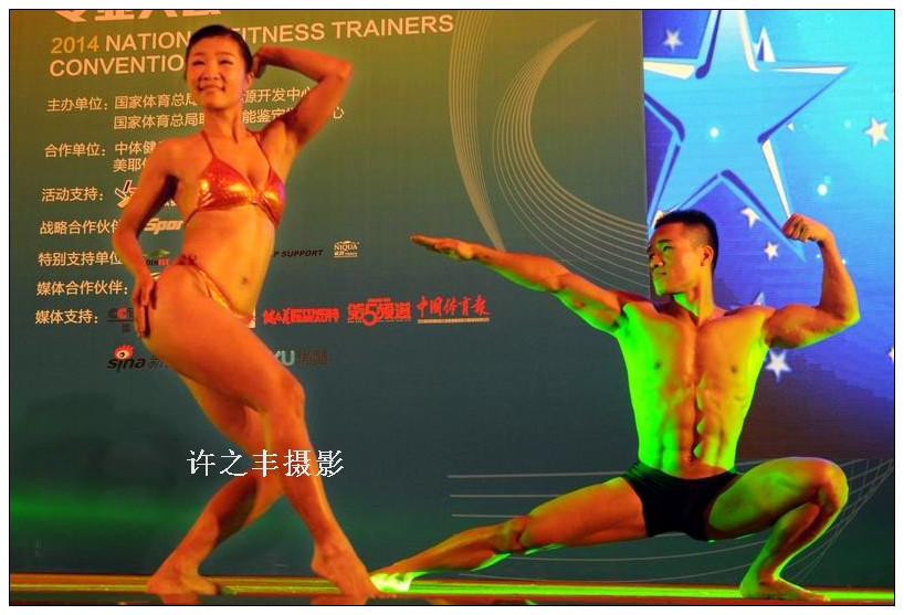 2014年11月30日,健身运动现如今无论出于工作压力还是形体问题,很多老百姓求助的都是健身房里的专业私教,而目前在健身房里备受普通老百姓的仰慕的私教们也在用着不断的学习和考核来提高自己的健身技能。在11月30日闭幕的,由国家体育总局人力资源开发中心、职业技能鉴定指导中心主办的“2014中国国家职业健身教练专业大会”以“我健身,爱健身”为主题,紧密贴合健身产业发展趋势,请业界名家的“专业培训”,全国优秀健身教练同场比拼的“职业技能竞赛”,还汇聚产业新知的“高峰论坛”,不断提高职业健身教练的专业知识和技术水平,更好地为大众健身服务。图为在大会上来自全国各省市自治区21个代表队的117名优秀职业健身教练以及上百名参会学员同场竞技进行“健身教练职业技能竞赛”。 工人日报中工网记者许之丰摄影报道