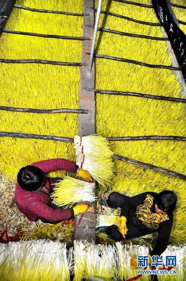 山东省沂源县悦庄镇中小消村的农家妇女在收获蒜黄(11月27日摄)。冬日时节,山东省沂源县各级妇联通过举办创业技术培训班等形式,积极引导农家妇女开展冬季创业增收。目前,该县已形成蒜黄养殖、工艺品加工、粉产品制作等20余个增收产业,从业农家妇女达到2万余名,成为冬季农民增收创业的主力军。新华社发(赵东山 摄)