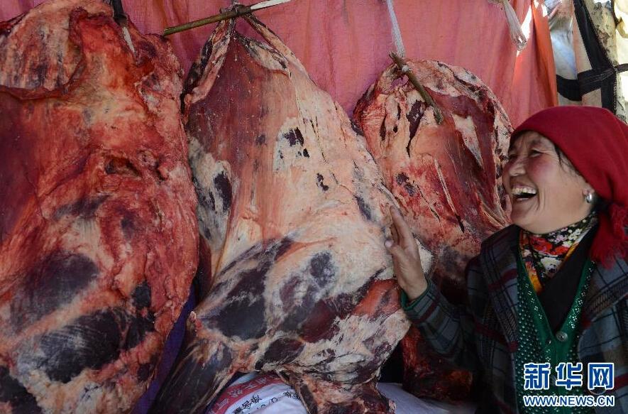 12月1日,牧民在交流会上出售牛肉。当日,为期7天的西藏雅砻物资交流会在山南地区乃东县开幕,来自西藏12个县及青海、四川等地的5000多家商户参会,当日有5.6万人参加交易。这一交流会是目前西藏最大的物资交流会,成为农牧民展销特色产品、增加收入的重要渠道。觉果 摄