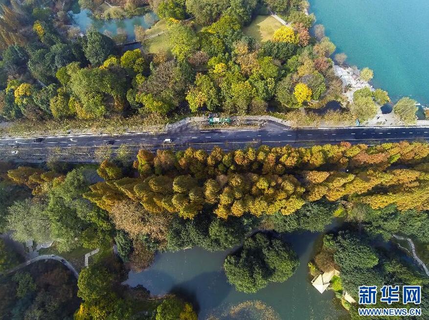 杭州西湖景区南山路边的树木呈现出多彩的层次,与蓝色的西湖构成了一幅七彩画卷(12月1日摄)。