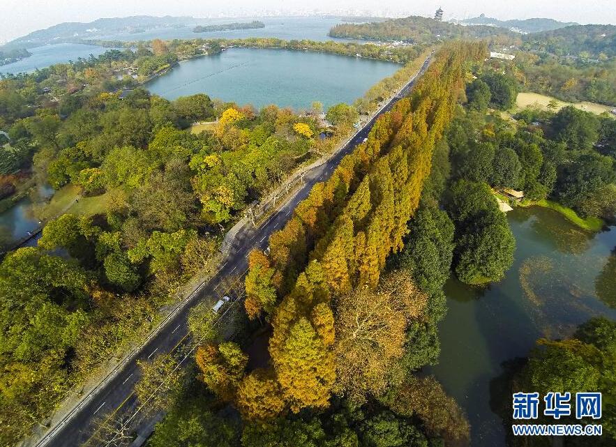 近期随着强冷空气的来临,杭州西湖景区也迎来了最美的“七彩时节”。银杏、红枫、香樟等树木呈现出黄、棕、红、绿等多种色彩,与绿色的茶园、蓝色的湖水组成了一幅幅七彩画卷。徐昱 摄