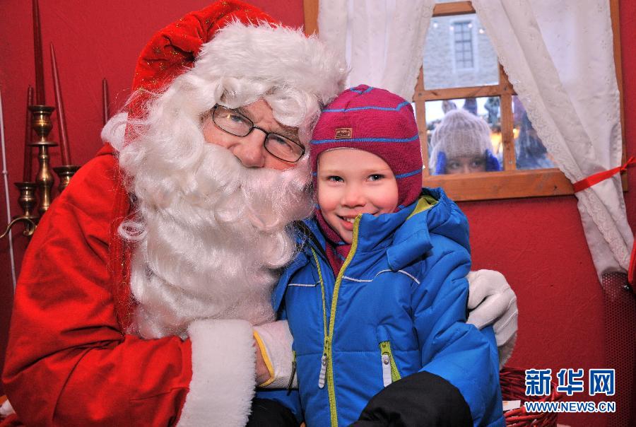 11月30日,在爱沙尼亚首都塔林,一名小朋友与圣诞老人合影。当日,人们在爱沙尼亚首都塔林的老城广场庆祝圣诞季开市。人们将从遥远林区伐来的23米高圣诞杉树矗立在广场中央,从传统风格的木屋中购买各种圣诞食品和商品。新华社发(维克托摄)