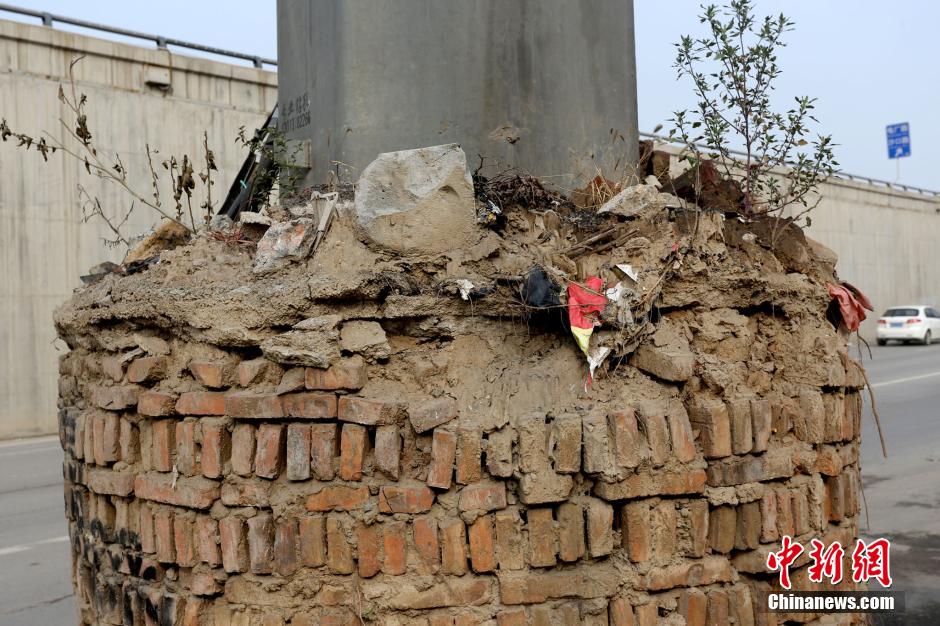 11月28日,河南郑州,一名行人从“土砖墩电线杆”旁边绕道经过。在郑州市北三环与电厂东街交叉口处的马路中央,立着一根30米左右高的高压电线杆,线杆的基座居然“长”在一个2米高、直径2米宽的圆形土墩上,外面圈了一层红砖。这个立在车水马龙路中央的“土砖墩电线杆”不仅阻挡行人和车辆通行,且看上去摇摇欲坠,十分危险,行人走在下面都捏了把汗。杨正华 摄