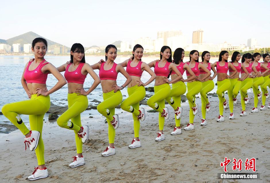 11月28日,由来自成都大学等高校女生组成的四川中博文化全明星女子健身队在三亚备战第4届三亚国际沙滩健美先生比基尼小姐大赛。其中有六名运动员在此次比赛结束后,还将代表中国队参加12月10日至17日在西班牙举行的世界古典健美健身锦标赛。图为赛前最后的冲刺训练现场。 安源 摄