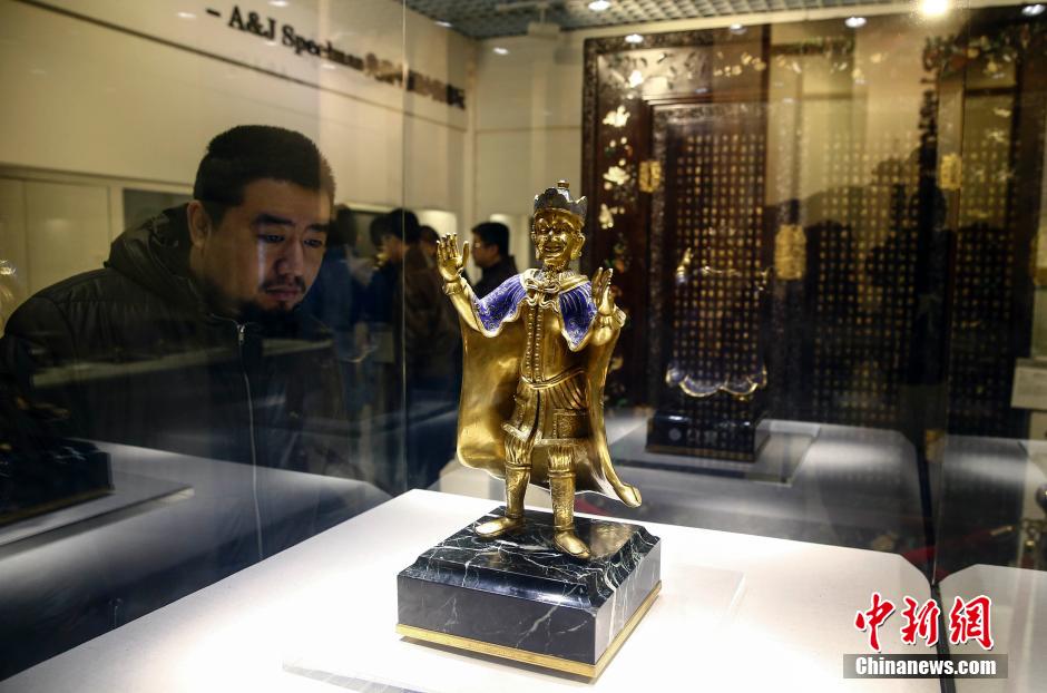 11月28日,一名观众正在清朝康熙年间的珐琅西洋人物像。当日,2014年保利秋拍预展在北京开启。 中新社发 张浩 摄