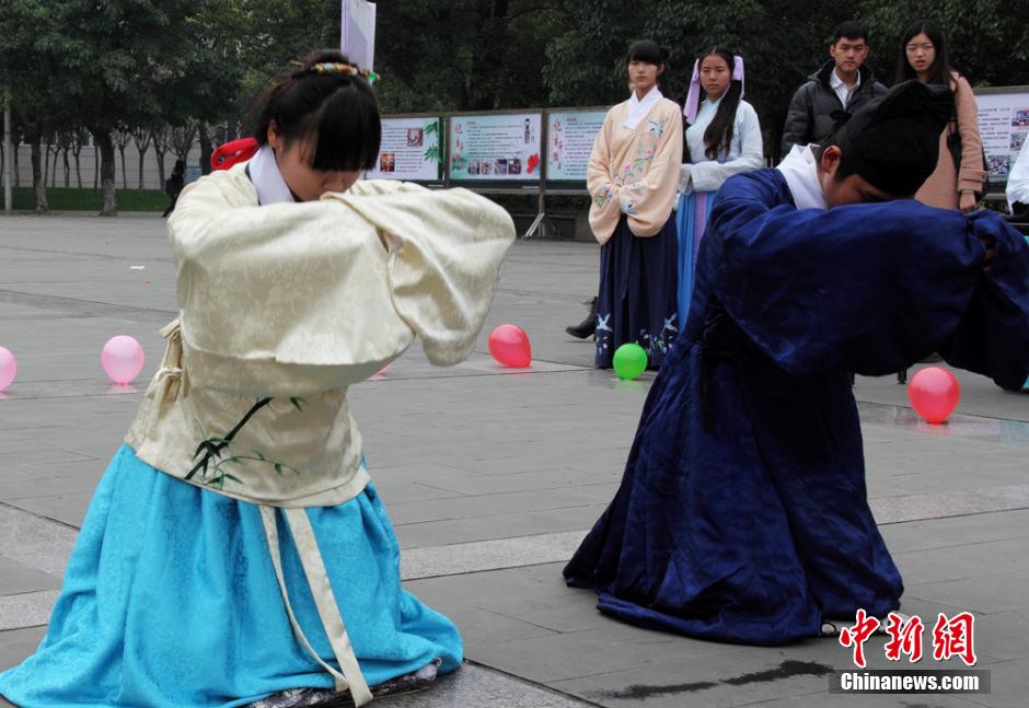 “迎宾、奏乐、行揖礼……”四川大学锦江学院学生日前举办了一场别开生面的汉式成人礼。两名“95后”学生身着汉服,在轩辕黄帝像前加冠、及笄、取字,跪拜父母师长,并誓言担起家庭、社会责任,真正长大成人。大一学生程煜桂的父母从什邡赶来,含泪见证了女儿的成人礼。麦宜杰摄