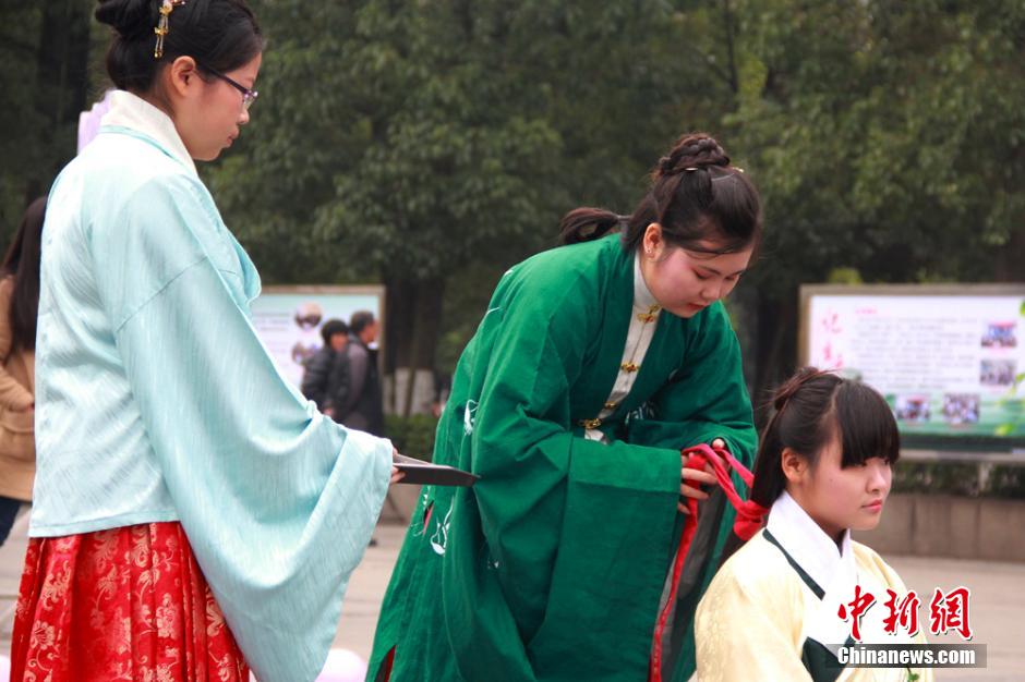 “迎宾、奏乐、行揖礼……”四川大学锦江学院学生日前举办了一场别开生面的汉式成人礼。两名“95后”学生身着汉服,在轩辕黄帝像前加冠、及笄、取字,跪拜父母师长,并誓言担起家庭、社会责任,真正长大成人。大一学生程煜桂的父母从什邡赶来,含泪见证了女儿的成人礼。麦宜杰摄