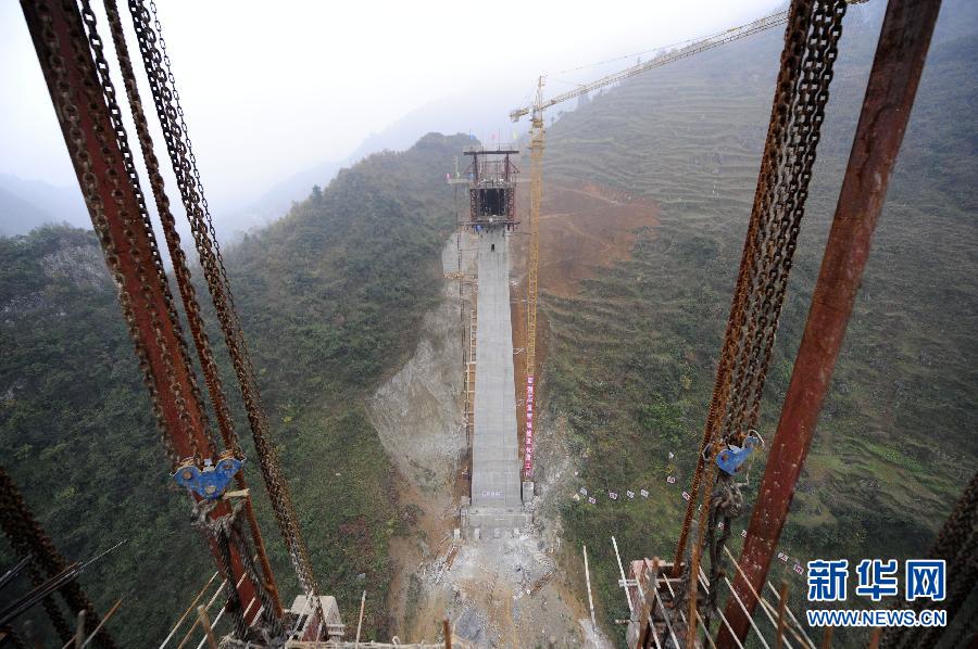 这是正在建设中的织纳铁路果比河大桥83米的主桥3号桥墩(12月2日摄)。由中铁十一局承建的织(织金)纳(纳雍)铁路是贵(贵阳)六(六盘水)铁路织金—纳雍—水城的其中一段,起于贵州织金县,从隆黄铁路织金北站引出,至贵州纳雍县雍熙镇沙锅寨村设纳雍客站,在雍熙镇海坝村设纳雍货运站。正线长60.1公里,设计时速为120公里,属单线电气化II级铁路,以货运为主。织纳铁路于2013年1月开工,预计2015年底建成通车,目前建设进入攻坚阶段。 新华社记者郝同前摄