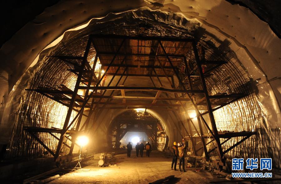 这是正在建设中的织纳铁路挖银子隧道(12月2日摄)。由中铁十一局承建的织(织金)纳(纳雍)铁路是贵(贵阳)六(六盘水)铁路织金—纳雍—水城的其中一段,起于贵州织金县,从隆黄铁路织金北站引出,至贵州纳雍县雍熙镇沙锅寨村设纳雍客站,在雍熙镇海坝村设纳雍货运站。正线长60.1公里,设计时速为120公里,属单线电气化II级铁路,以货运为主。织纳铁路于2013年1月开工,预计2015年底建成通车,目前建设进入攻坚阶段。 新华社记者郝同前摄