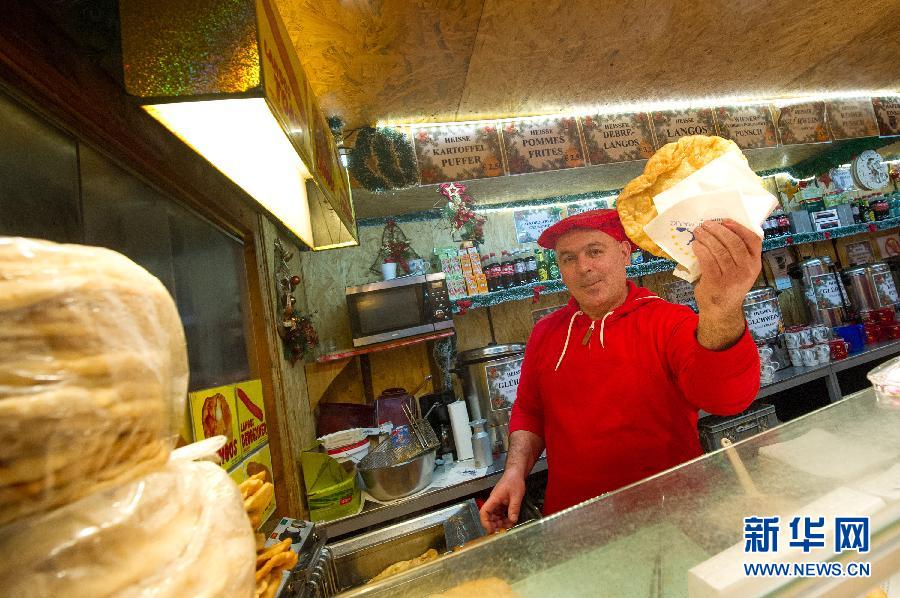 12月2日,在奥地利首都维也纳市政厅广场圣诞市场,一名摊位老板在出售浇着蒜汁的油饼。每年圣诞节前的几个星期,奥地利维也纳市政厅广场的圣诞市场都热闹非凡。市民和游客在靓丽彩灯下漫步,大小摊位间各色美食、美酒散发出的香气以及圣诞糖果绚丽的色彩,烘托出日益浓重的圣诞气氛。新华社记者钱一摄