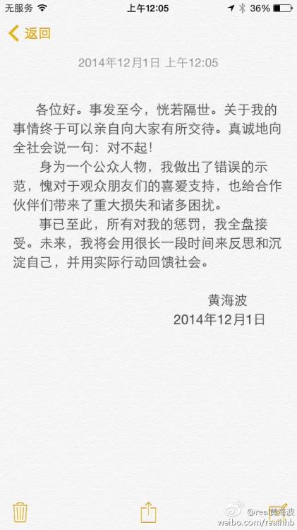 12月1日凌晨,黄海波释放后通过新浪微博首次发布声明,称愧对观众,所有惩罚全盘接受。今年5月15日其在嫖娼时被警方抓个正着,先是被处以15日行政拘留,随后被收容教育6个月。图片来源:黄海波认证微博