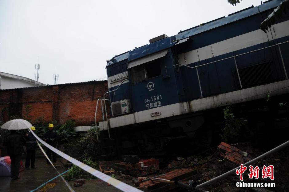 12月3日10时许,南宁铁路局柳州机车车辆厂一辆火车头在专用线调度过程中脱轨,冲倒挡土墙进入附近的和平路小区,未造成人员伤亡。事故发生后铁路相关部门立即赶往现场进行处置。据现场工作人员介绍,该火车头约以5公里每小时行进,冲入铁轨末端土包后冲倒挡土墙,进入和平路小区约5米。初步调查为机械故障,事故原因仍在进一步调查当中。黄威铭 摄