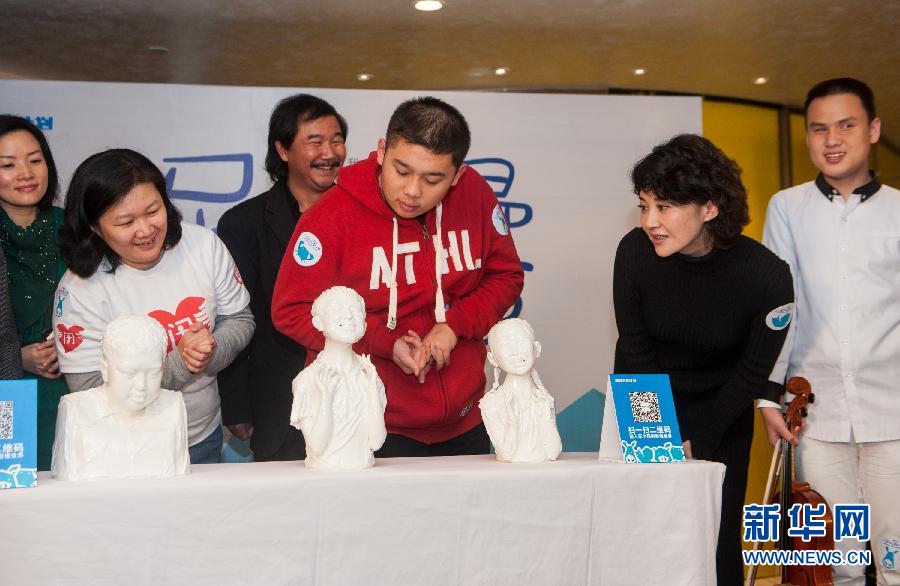 12月3日,活动推广大使、演员许晴(右二)在活动上欣赏展出的3个雕塑。