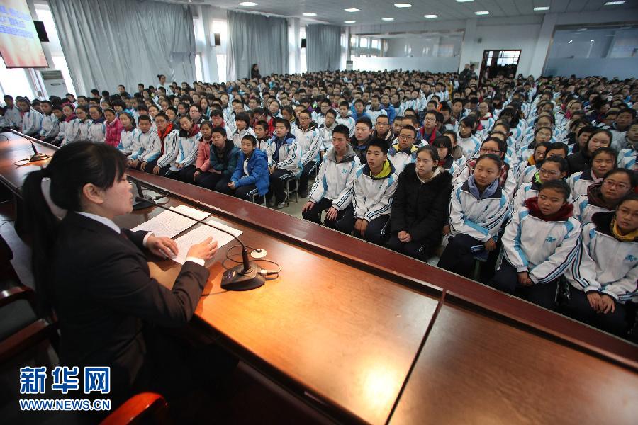 12月3日,河北张家口市桥东区法官为学生举办法律讲座。当日,河北张家口市桥东区人民法院在张家口第七中学开展法制宣传活动,通过法律讲座及模拟法庭增强学生的法律观念及自我保护意识。 新华社发(武殿森 摄)