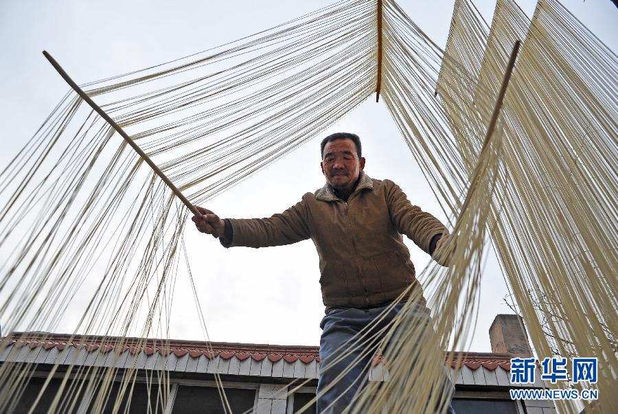 12月3日,运城市永济市开张镇常旗营村村民李新民在制作传统手工挂面。山西省运城市永济市开张镇常旗营村是当地有名的传统手工挂面加工特色村。每到冬闲时节,当地农户便以家庭作坊的方式加工挂面,每个加工户平均一个冬闲季可增收万元左右。新华社发(刘宝成 摄)