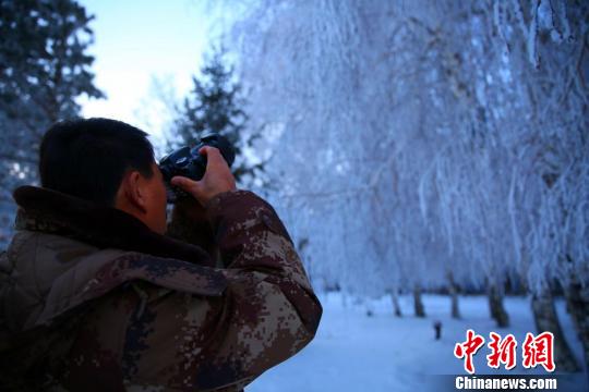 12月2日,新疆哈巴河县受超低温天气的影响,出现大面积霜挂美景,当地群众拍摄雾松。刘是何 摄