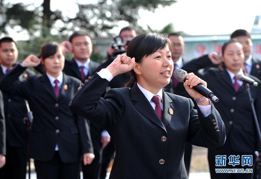 12月2日,在湖北武汉市江夏区乌龙泉街群建村党员活动中心外的广场上,作为湖北省“12·4”国家宪法日暨法治宣传日“法律进乡村”集中展示活动的一项内容,20名法官和检察官代表举行向宪法宣誓活动。当日,各地司法部门举办多种活动迎接国家宪法日。11月1日,第十二届全国人民代表大会常务委员会第十一次会议决定将12月4日设立为国家宪法日,在全社会开展宪法宣传教育活动。肖艺九 摄 图片来源:新华网