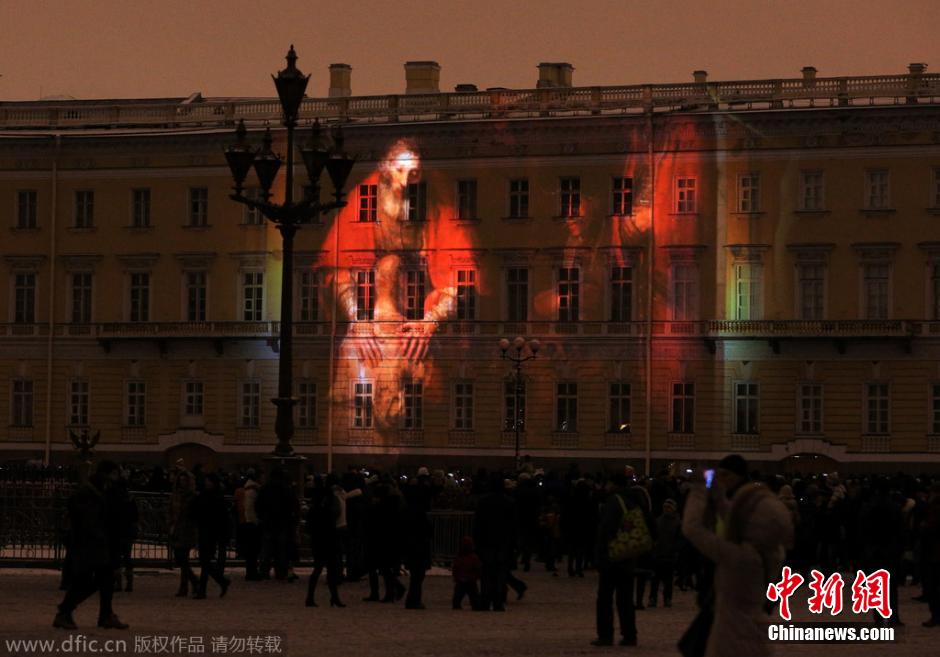 当地时间2014年12月6日,俄罗斯圣彼得堡,民众聚集在冬宫广场参加庆祝国立艾尔米塔什博物馆建馆250周年的3D灯光秀。 图片来源:东方IC 版权作品 请勿转载