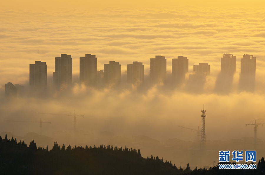 11月24日清晨,天津蓟县出现云海奇观,县城的楼群跃动在云雾之中,若隐若现。新华社发(赵敬波 摄)