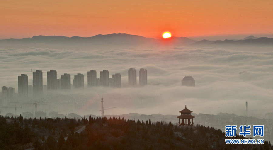 12月8日,天津蓟县于桥水库出现水上云海,并向西涌进蓟县县城,高层建筑漂浮在云海之上,场面蔚为壮观。 新华社发(王广山 摄)