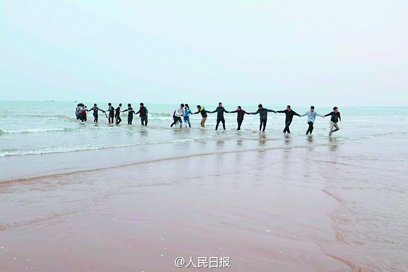 图为图为大家手拉手将女子救上岸。 图片来源:人民日报官方微博