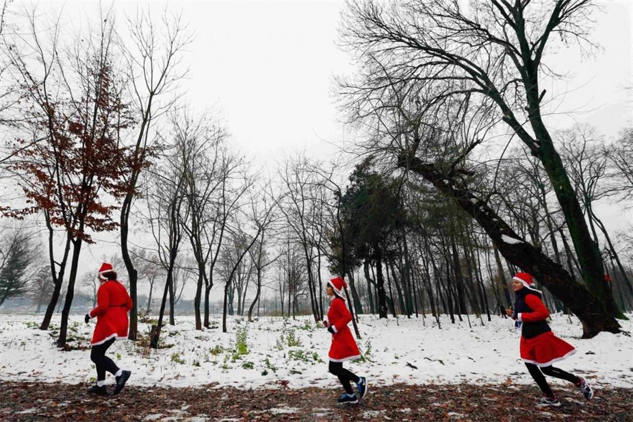 罗马尼亚布加勒斯特附近,圣诞老人们在赛跑。