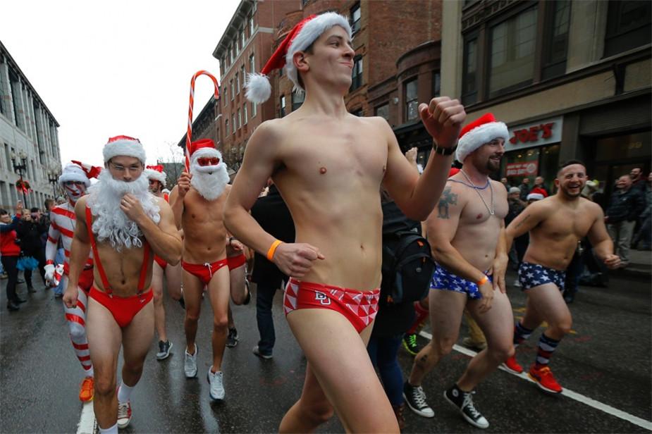 美国马萨诸塞州波士顿,年度圣诞老人泳装赛跑。