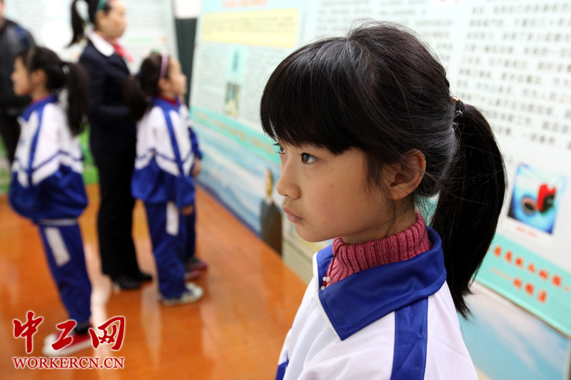 一名学生在法制教育展厅展板前认真阅读学习。中工网记者 李雪峰摄
