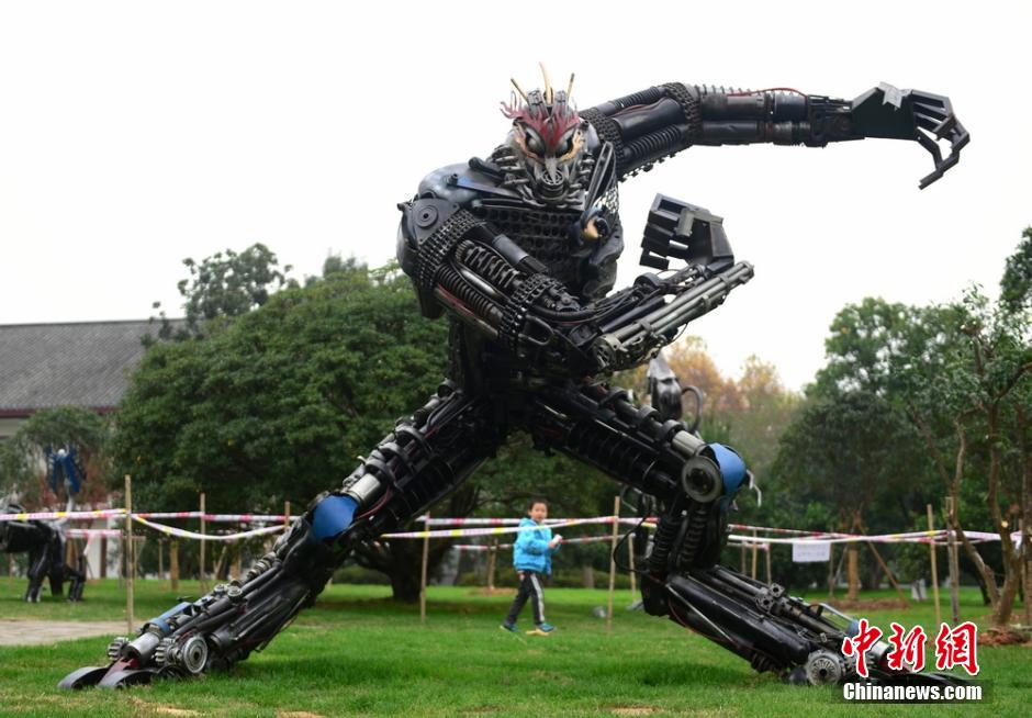 湖南一高校师生收集废旧钢铁办“变形金刚”展