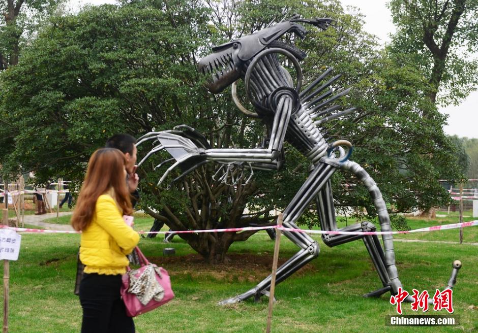 湖南一高校师生收集废旧钢铁办“变形金刚”展