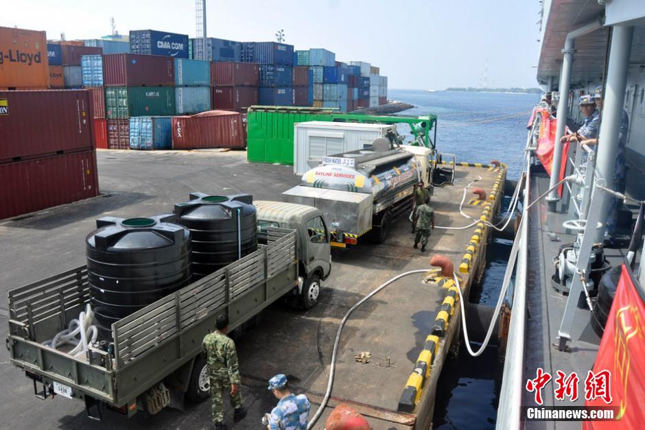 12月9日15时,经过近20个小时的紧张工作,中国海军长兴岛船顺利完成为马尔代夫马累市输送600余吨淡水的任务。12月4日,马累唯一的海水淡化厂发生火灾,设备损毁,这个印度洋上的岛国首都迅速陷入淡水资源短缺危机中。图为长兴岛船向水罐车输送淡水。中新社发 姜立堃 摄