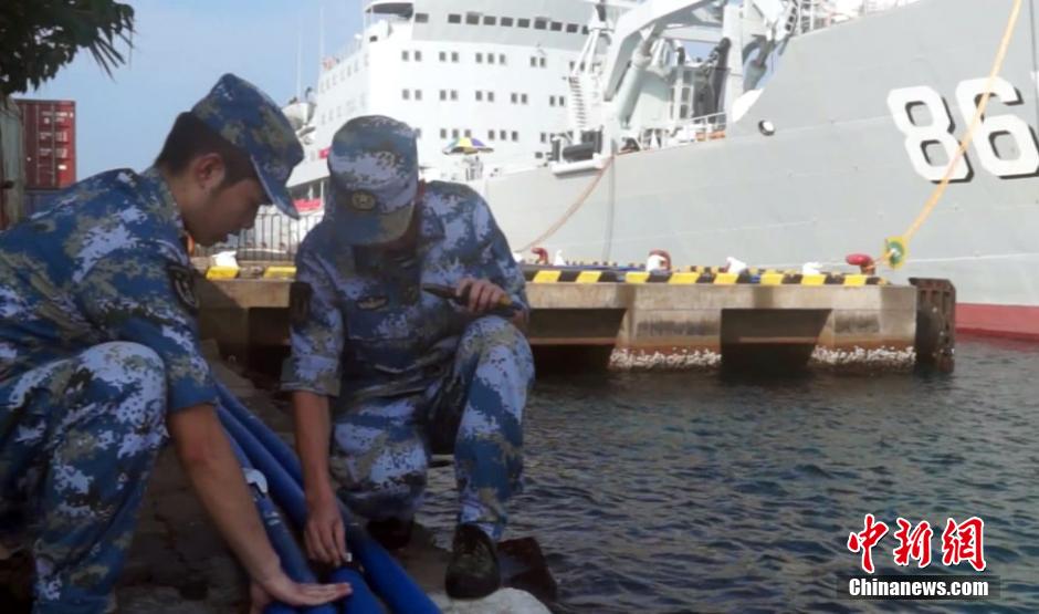 12月9日15时,经过近20个小时的紧张工作,中国海军长兴岛船顺利完成为马尔代夫马累市输送600余吨淡水的任务。12月4日,马累唯一的海水淡化厂发生火灾,设备损毁,这个印度洋上的岛国首都迅速陷入淡水资源短缺危机中。图为长兴岛船官兵巡视供水管路。中新社发 孙志江 摄