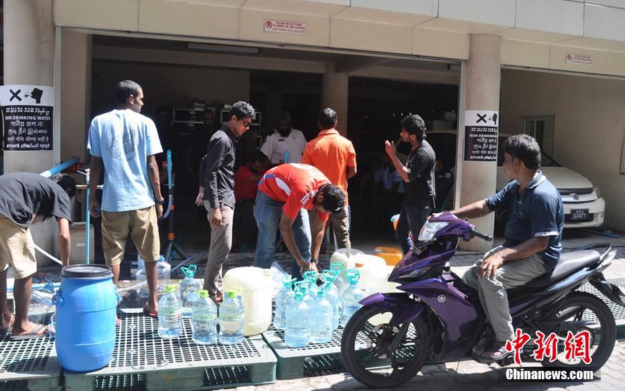 12月9日15时,经过近20个小时的紧张工作,中国海军长兴岛船顺利完成为马尔代夫马累市输送600余吨淡水的任务。12月4日,马累唯一的海水淡化厂发生火灾,设备损毁,这个印度洋上的岛国首都迅速陷入淡水资源短缺危机中。图为马累市民在供水点领取淡水。中新社发 姜立堃 摄