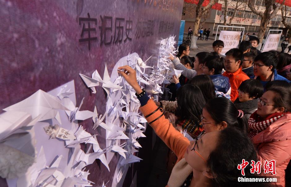 12月9日,南京农业大学两千多位师生在卫岗校区举行“千人共制公祭菊”活动,通过自制白色菊花和千纸鹤,将其组成“12.13”字样,并在爱国主题标语上签上自己的名字,牢记历史,祭奠哀思。王爽 摄