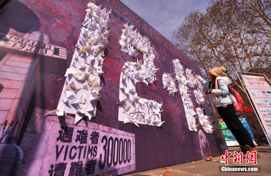 12月9日,南京农业大学两千多位师生在卫岗校区举行“千人共制公祭菊”活动,通过自制白色菊花和千纸鹤,将其组成“12.13”字样,并在爱国主题标语上签上自己的名字,牢记历史,祭奠哀思。王爽 摄