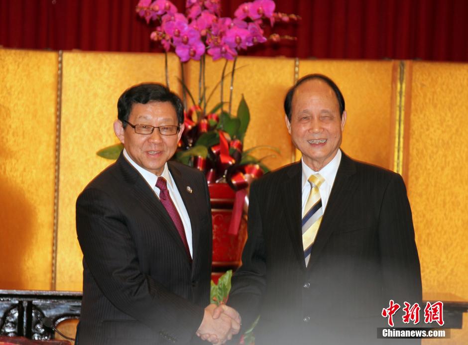12月9日,应台湾海基会邀请,海峡两岸关系协会会长陈德铭率“海协会经贸交流团”来台展开8天参访。图为林中森(右)当晚会见陈德铭(左)及海协会经贸参访团一行。中新社发 刘舒凌 摄