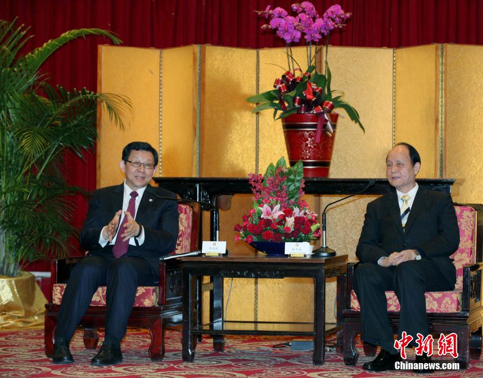 12月9日,应台湾海基会邀请,海峡两岸关系协会会长陈德铭率“海协会经贸交流团”来台展开8天参访。图为林中森(右)当晚会见陈德铭(左)及海协会经贸参访团一行。中新社发 刘舒凌 摄