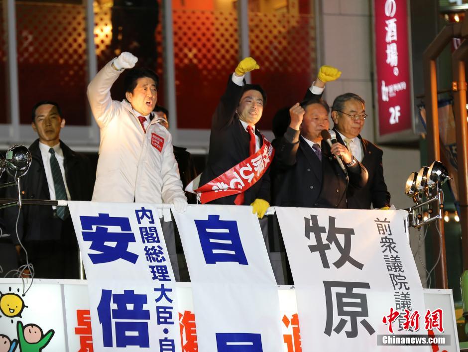 12月9日,日本朝野各党派要员为不断升温的众议院选举拉票而进行的全国巡回街头演说,进入最后的冲刺阶段。图为当天晚上,自民党总裁安倍晋三从福岛县赶到了埼玉县的大宫车站进行街头演说,为自民党候选人拉票。中新社发 高越 摄