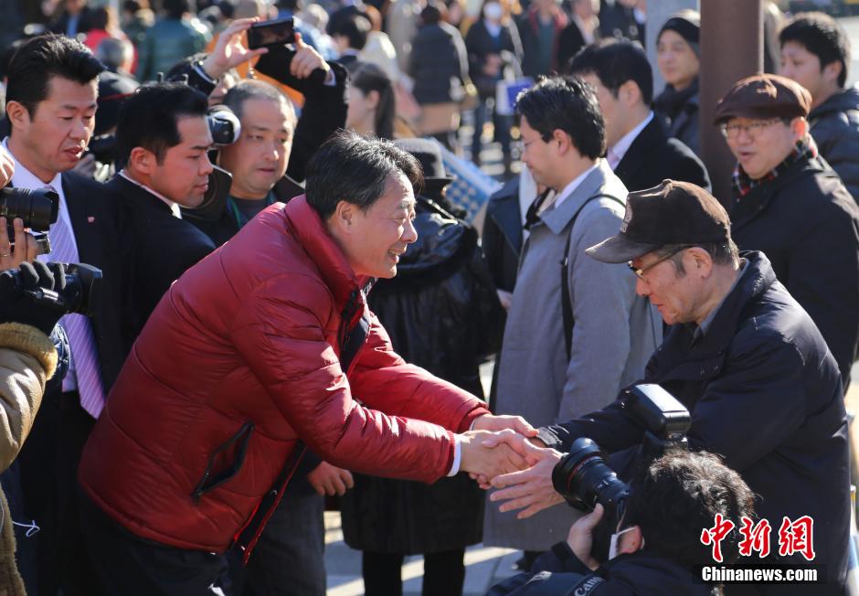 12月9日,日本朝野各党派要员为不断升温的众议院选举拉票而进行的全国巡回街头演说,进入最后的冲刺阶段。图为当天下午,民主党党首海江田万里在东京的品川车站进行街头演说,并与现场市民互动。中新社发 高越 摄