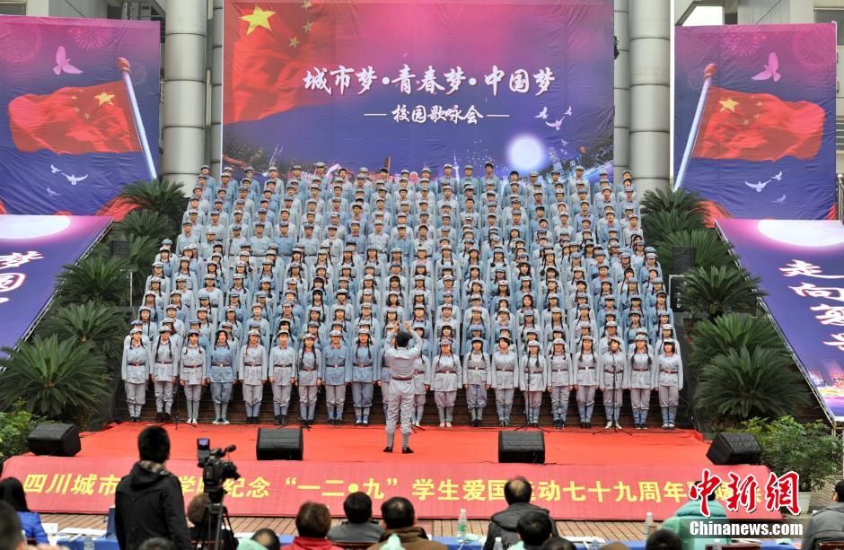 12月9日,身穿红军服的大学生们正在进行歌咏比赛。当日,四川城市职业学院千余师生举行歌咏比赛纪念“一二·九”学生爱国运动79周年,大学生们用歌声缅怀过去,畅想未来。中新社发 刘忠俊 摄