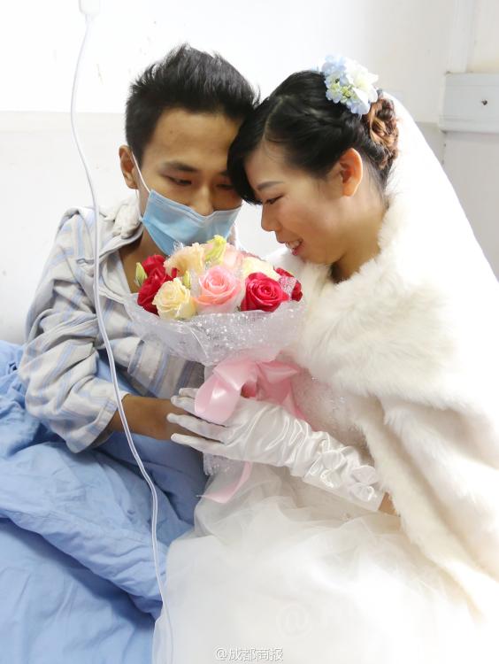 他,25岁,不幸患上急性白血病。她,19岁,是他已恋爱3年的女友。12月8日,乐山夹江县某医院的一间病房里,身穿婚纱、手捧玫瑰的黄月突然出现,病床上的王健伟惊呆了。原来,她悄悄安排了这场"病房婚礼",希望能鼓励男友战胜病魔。 记者顾爱刚 图片来源:成都商报官方微博