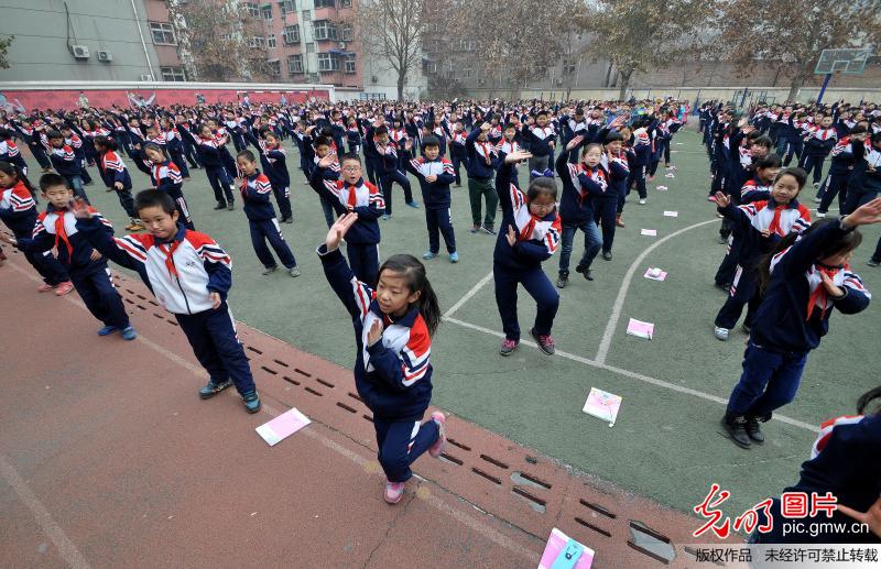 近日,河北省邯郸市渚河路小学采用师生喜闻乐见的流行歌曲创编学校集体舞的全新形式,将传统的课间操改成"小苹果",全校2400多名师生齐跳"小苹果",通过跳舞的形式释放学习、工作压力,身心得到娱乐。(郝群英摄/光明图片)