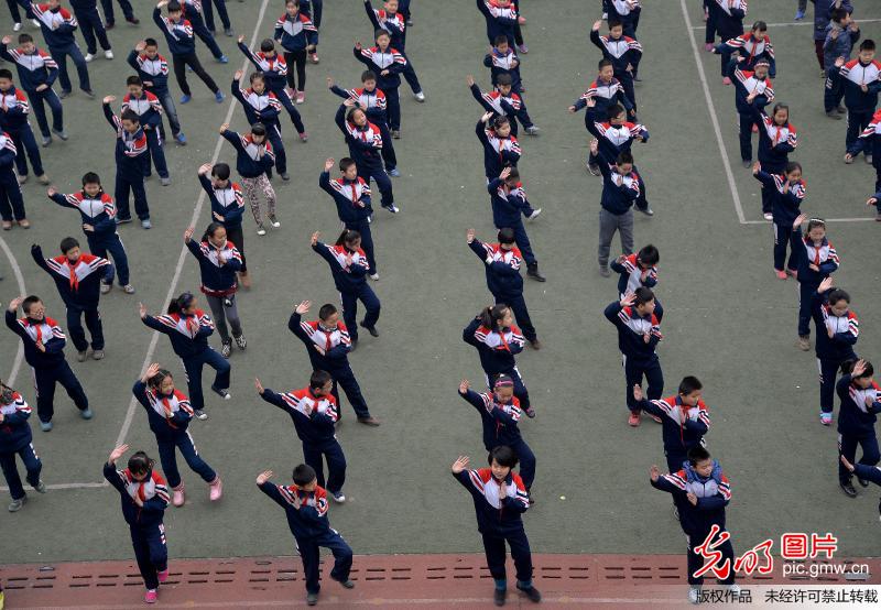 近日,河北省邯郸市渚河路小学采用师生喜闻乐见的流行歌曲创编学校集体舞的全新形式,将传统的课间操改成"小苹果",全校2400多名师生齐跳"小苹果",通过跳舞的形式释放学习、工作压力,身心得到娱乐。(郝群英摄/光明图片