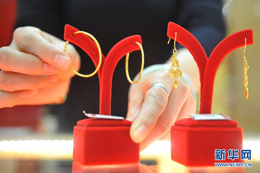 12月10日,浙江省临安市一家金店的店员在整理黄金饰品。美元下跌推升国际金价,纽约商品交易所黄金期货市场交投最活跃的2015年2月黄金期价12月9日比前一交易日上涨37.1美元,收于每盎司1232美元,涨幅为3.10%。新华社发(胡剑欢 摄)