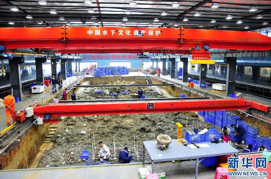 在位于广东海陵岛的海上丝绸之路博物馆里,在水下沉睡800多年的南宋商船“南海一号”,经过整体打捞、淤泥清理,现已进入沉船内部发掘和文物提取阶段,将有更多“海丝路”遗留文物重现人间。国家文物局水下文化遗产保护中心在“南海一号”的考古团队2日透露,自去年11月“南海一号”保护发掘项目正式启动至今,已出土小件器物瓷器标本623件,金器107件,漆木器11件,铜钱5000余枚,残损标本2100多件,另有少量动植物残骸。 黄国保 摄 图片来源:新华网
